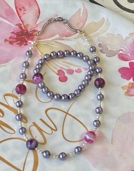 Perlen Set, Kette und Armband mit pink und violetten Achat Kugeln