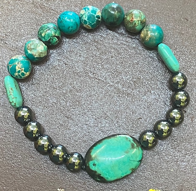 Der Chrysokoll ist ein wunderbarer Stein, um wieder in die Kraft und innere Mitte zu kommen, Er wirkt beruhigend auf das Herzchakra und die Nerven und lindert Anspannung und Stress. Chrysokoll bringt Gelassenheit und Selbstvertrauen und seine wohltuende Energie wirkt besonders im Hals-, Stirn-, und Herz Chakra. Er steigert das Selbstbewusstsein und lässt uns in stressigen Zeiten achtsam und ruhig bleiben. Hämatit ist ein starker Schutzstein und hilft in der Erdung. Er bringt Ruhe und Entspannung.