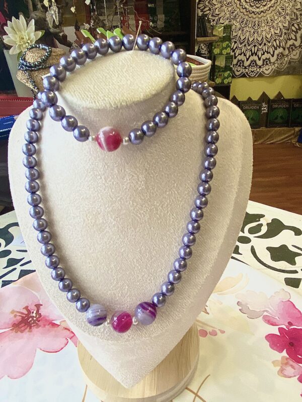 Schreibe die erste Bewertung für „Perlenkette und Perlenarmband mit rosa Achat Kugeln, Chakra Schmuck für das Kronenchakra“